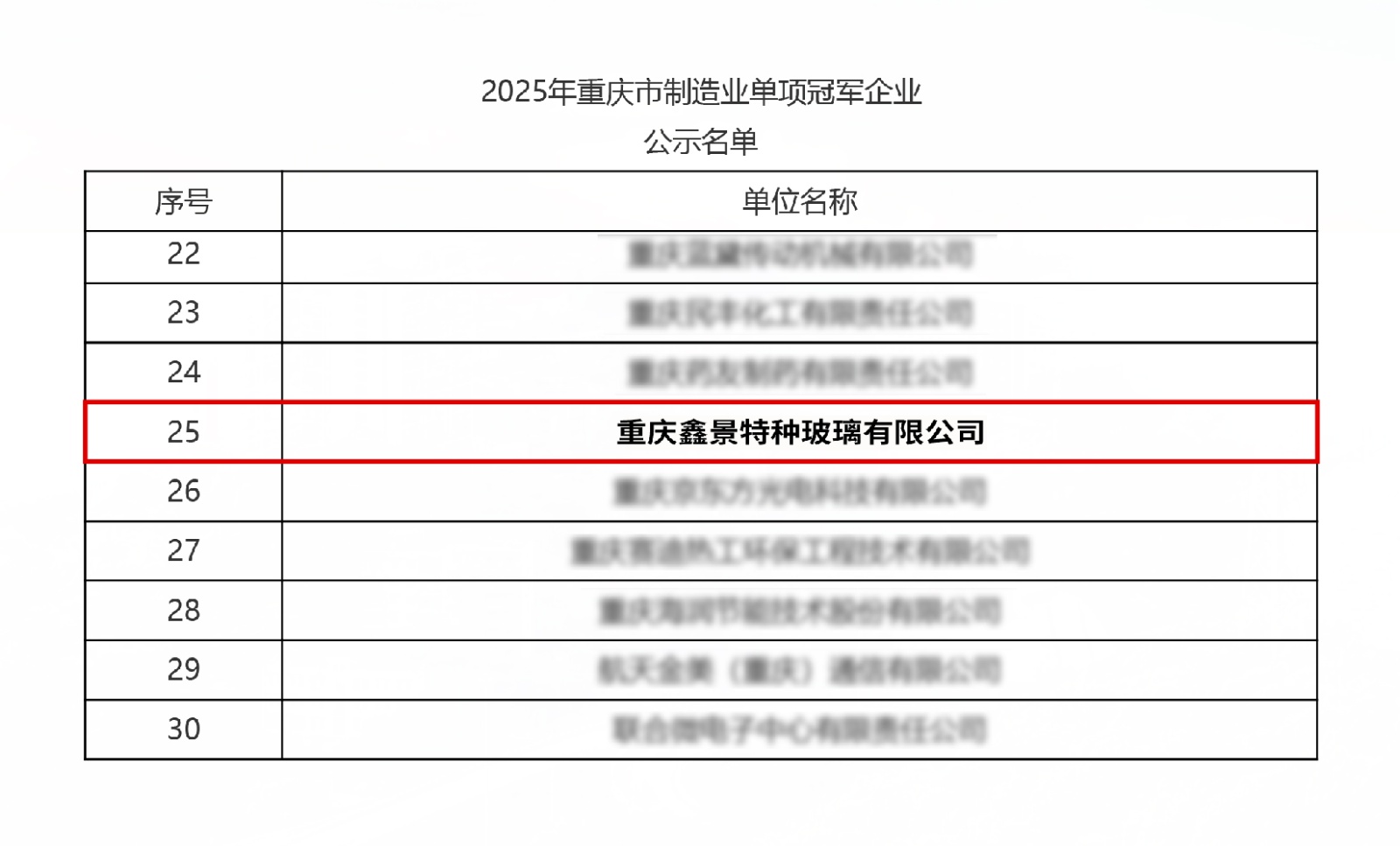 7月18日,市經(jīng)信委公示了2025年“重慶市制造業(yè)單項(xiàng)冠軍企業(yè)”名單,鑫景憑借在特種玻璃新材料領(lǐng)域的卓越表現(xiàn)成功入選,成為全市制造業(yè)高質(zhì)量發(fā)展的標(biāo)桿企業(yè)之一。